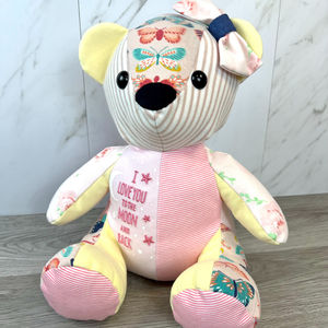 Also a great option for a memorial bear to honor those who have passed. Just 2-5 items of adult clothing or 8-10 neck ties are needed, depending on how many different patterns you want.